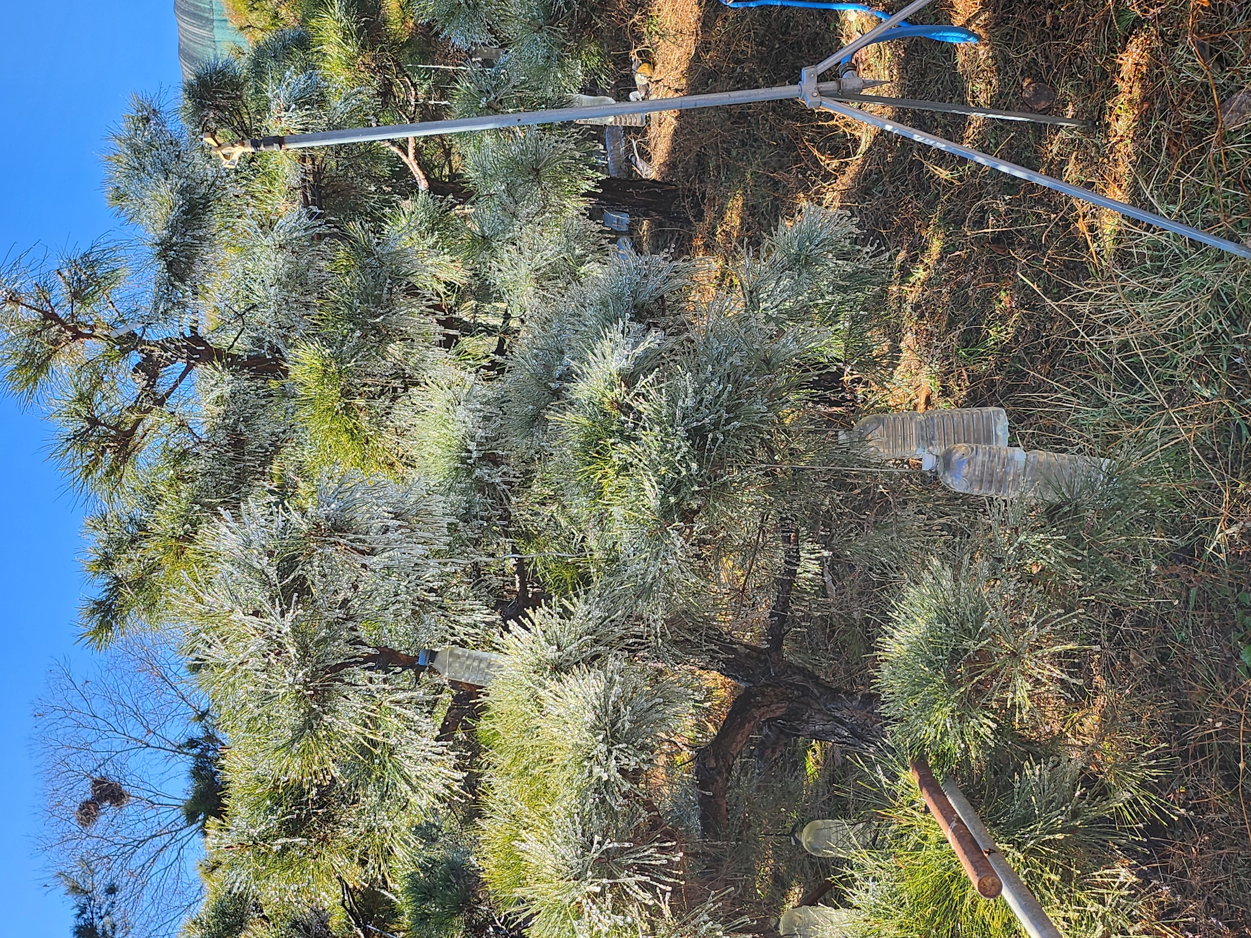 영하의 날씨로 조경소나무의 솔잎에는 물방울이 곧장 얼어붙어서 작은 고드름이 줄줄이 맺히고 있다.