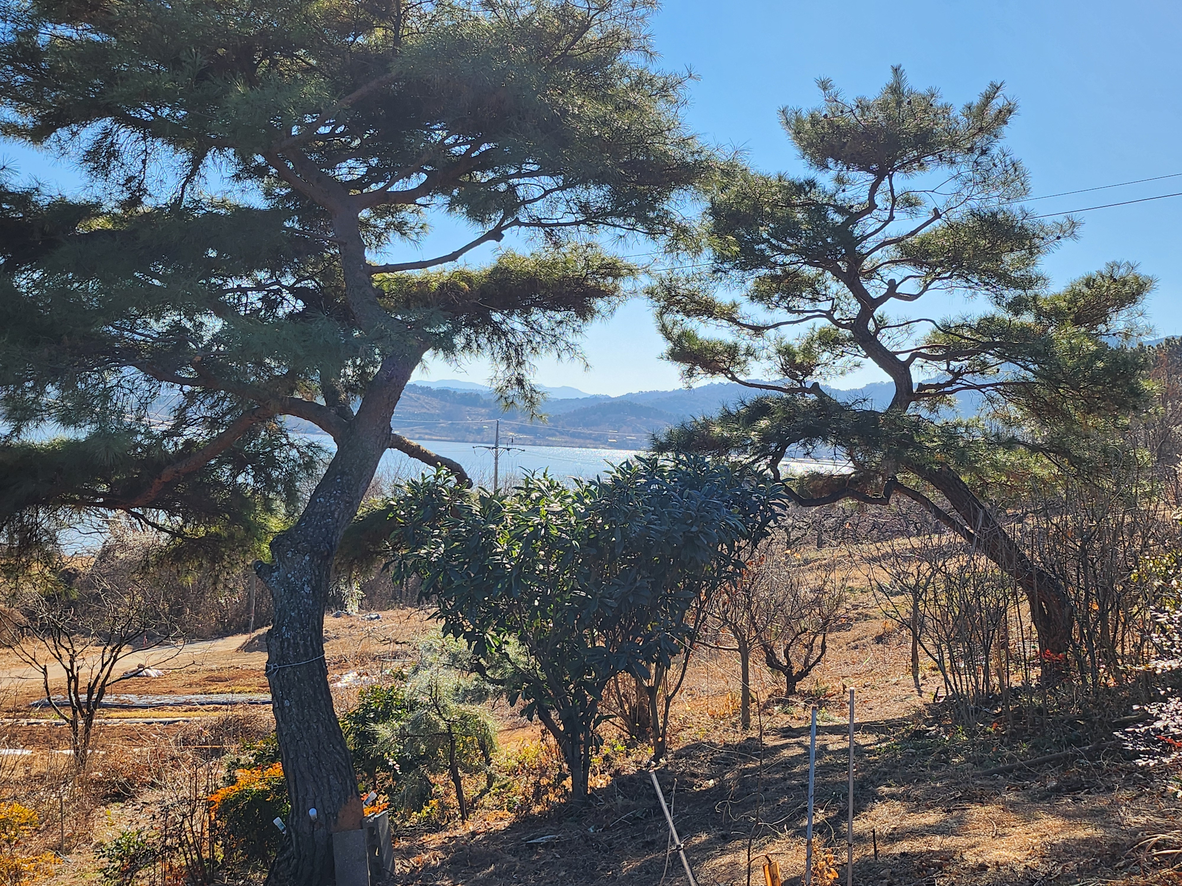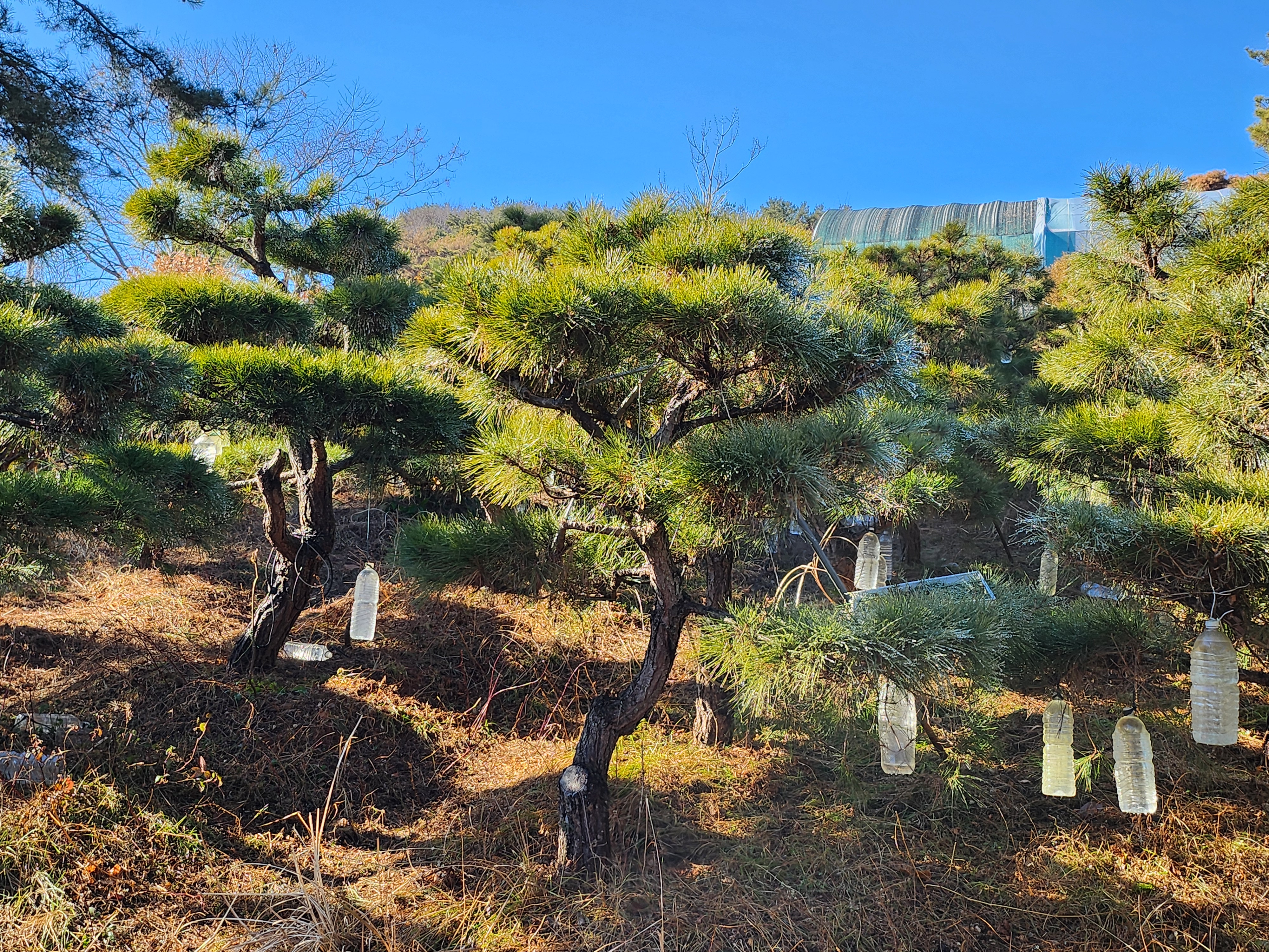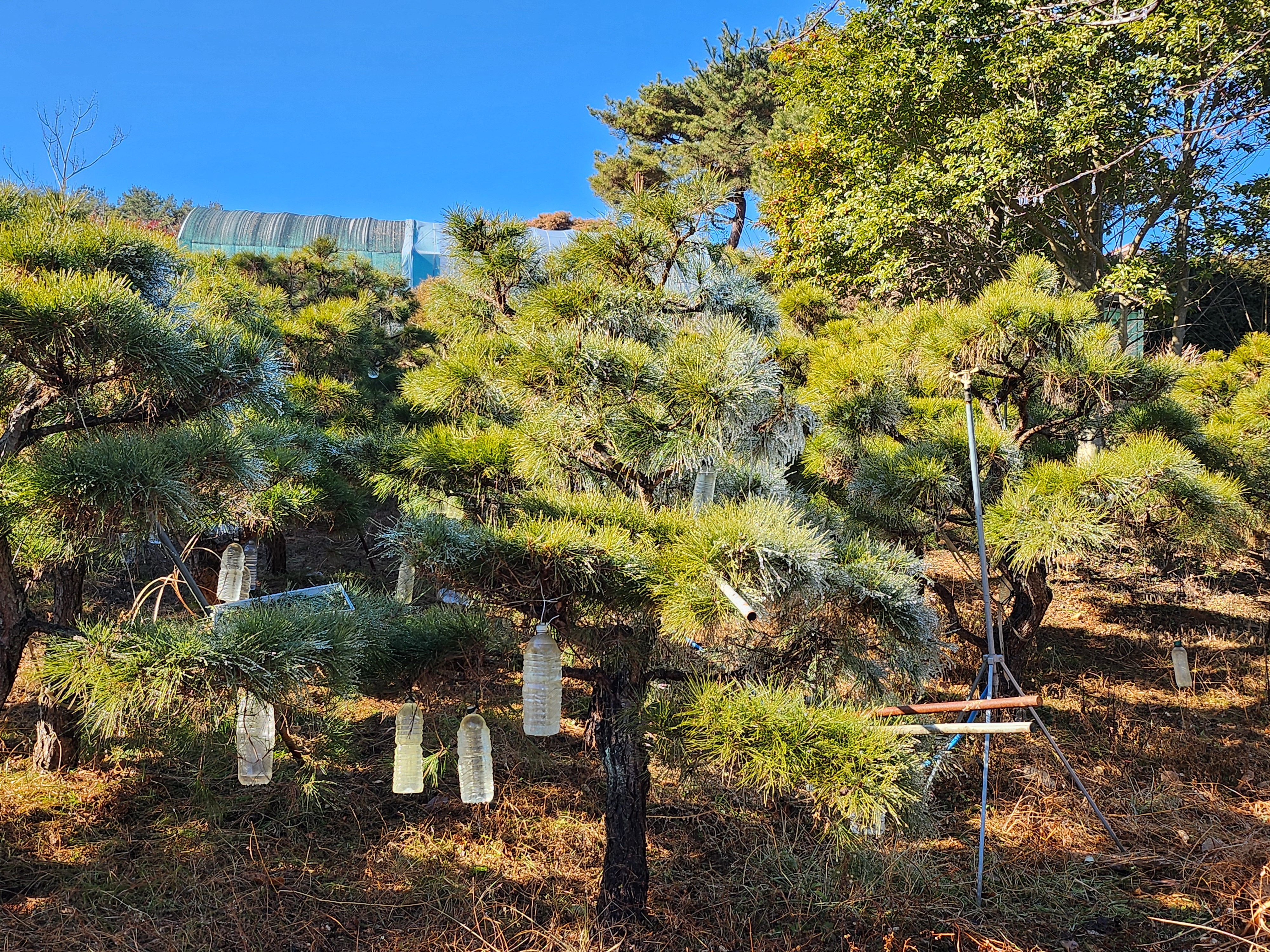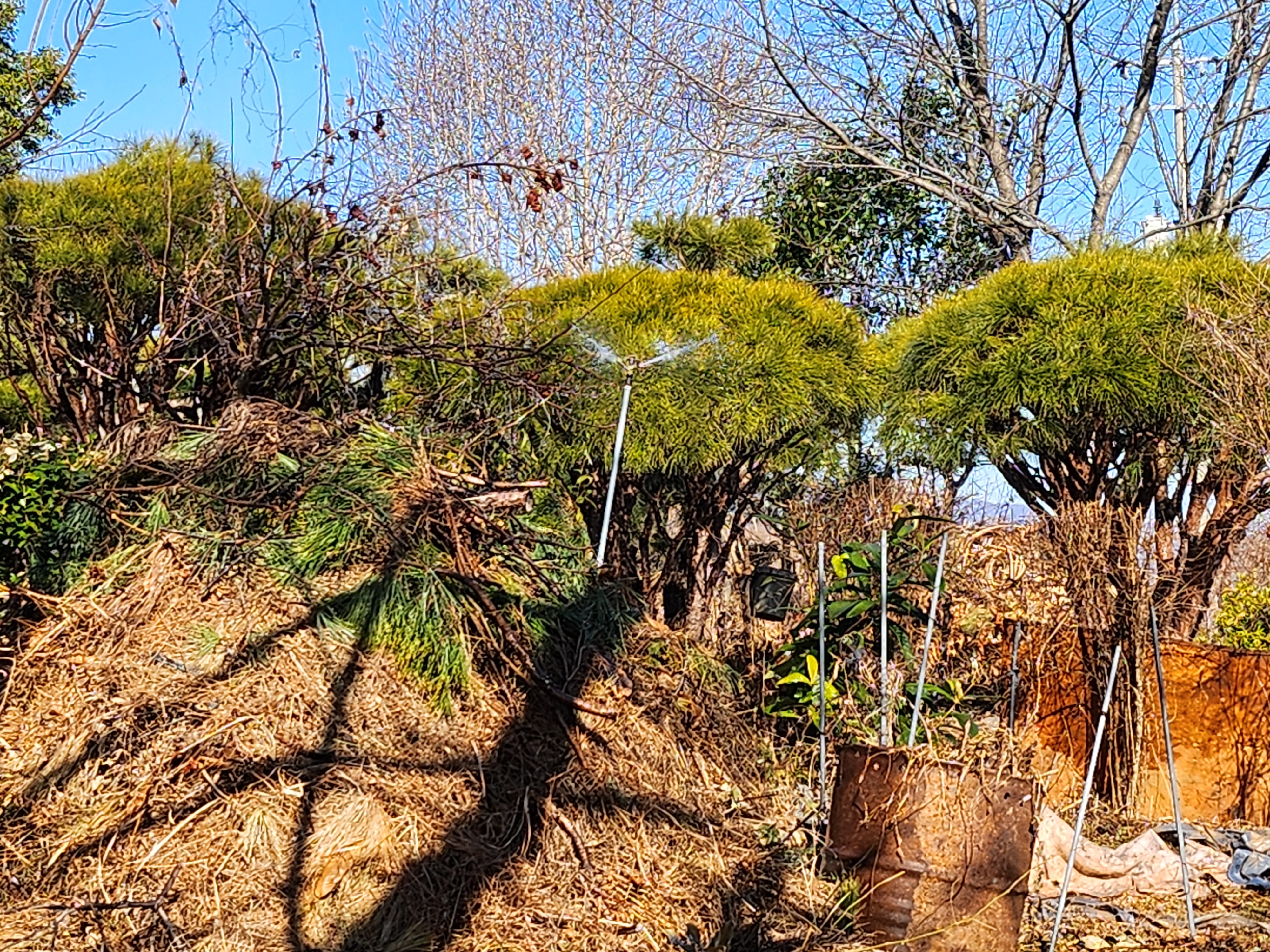 작년 말 늦게까지 전정작업 후 바닥에서 긁어모았던 솔갈피를 쌓아둔 농원입구에는 스프링클러 2조를 겹쳐서 배치하여 살수량이 충분히 뿌려지도록 조치하였다.